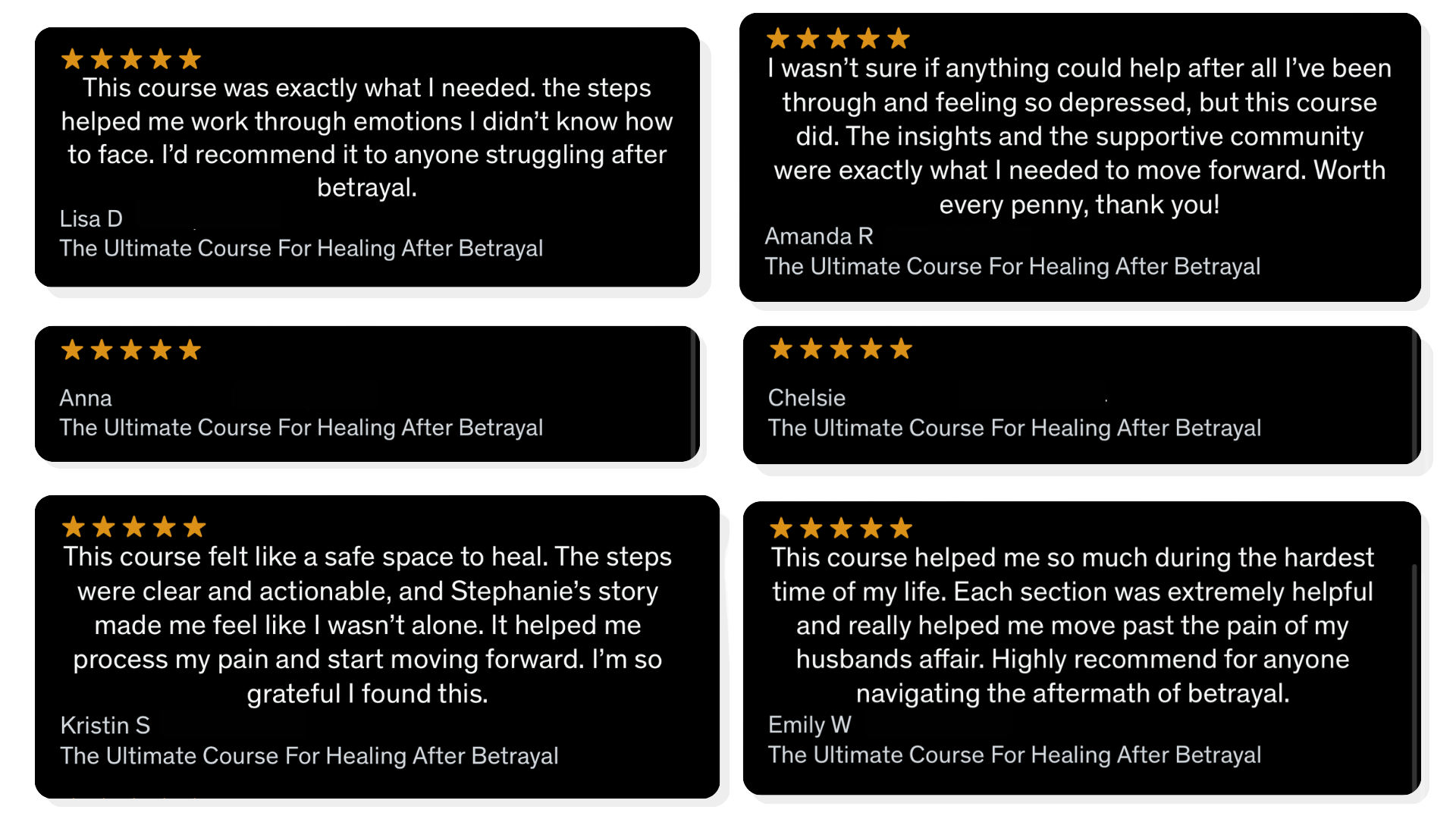 *To be eligible for a refund, you must complete the first three sections of the course and show that you’ve implemented the exercises. If, after going through the first three sections, you don’t feel like this course is helping you heal, just reach out to me at Hello@betterthroughbetrayal.com, and I’ll give you a full refund, no hassle, no hard feelings.